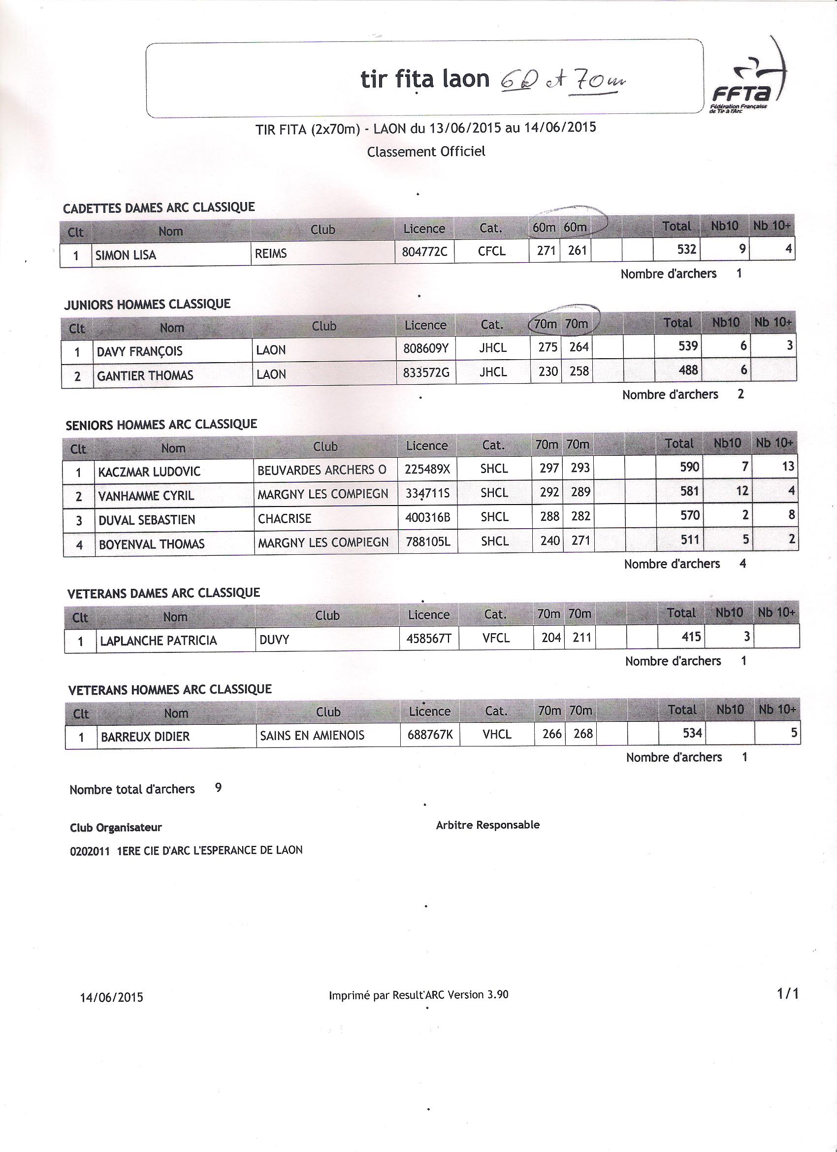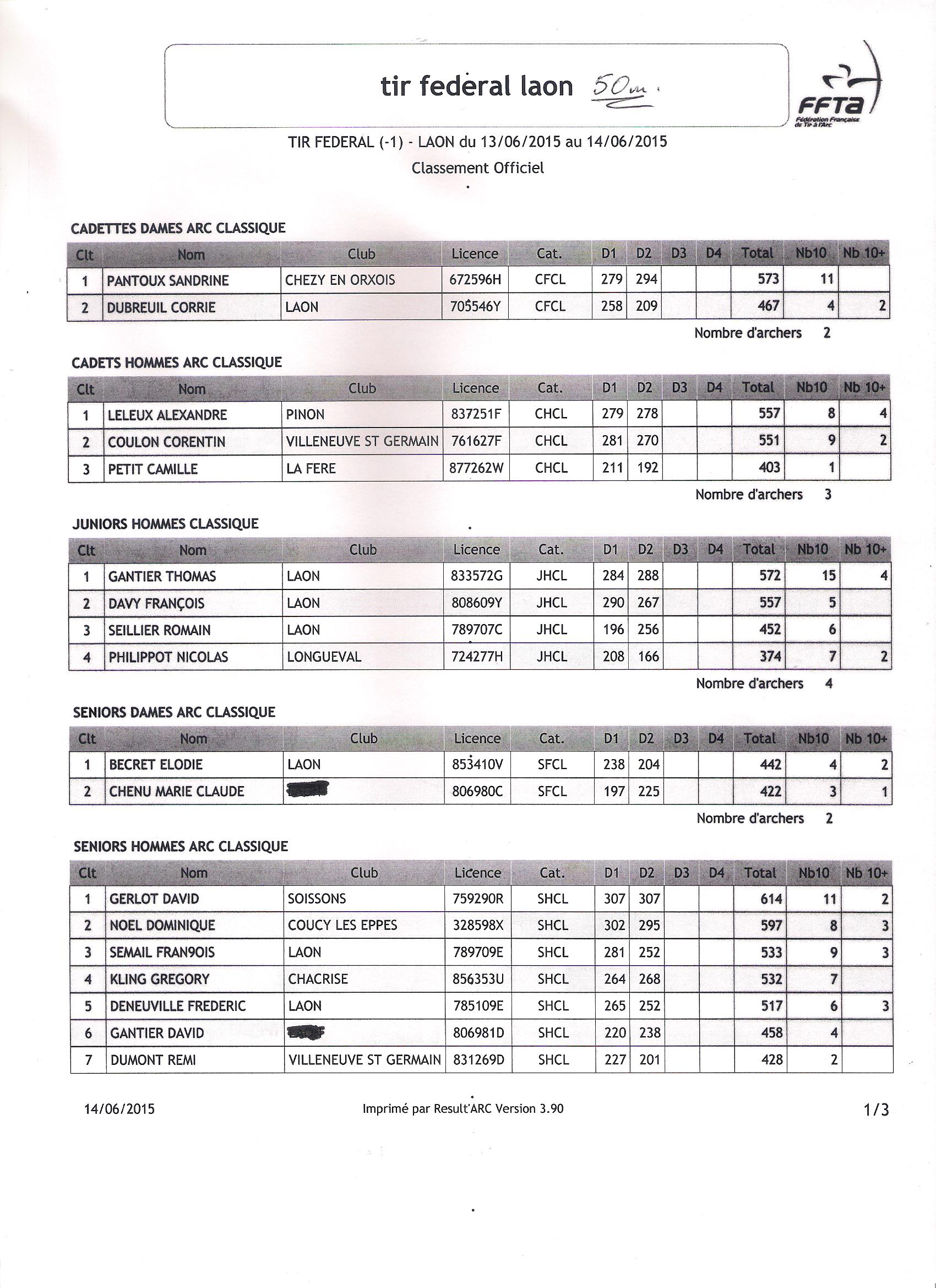 Résultats championnat Aisne du 24 et 25 janvier 2015 à Laon